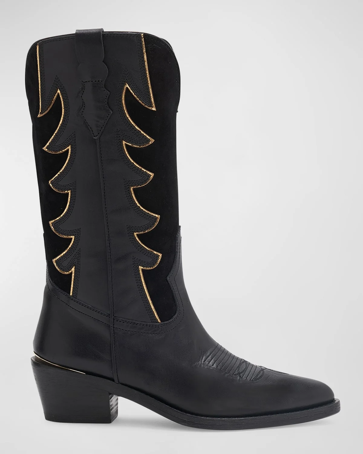 - Partlow "Rochelle" vegetable-dyed calf leather western boots with suede trim and metallic leather piping - 2.25 in / 55 mm block heel - Almond toe - Pull-on style - Pull tabs at the collar - 6mm padded insole - Signature Partlow plaque - Leather outsole - Lining: Leather - Care instructions: - brush off any dust or dirt with a soft bristle brush or soft cloth. Store boots in protective dustbags provided between wearings. - Made in Italy
