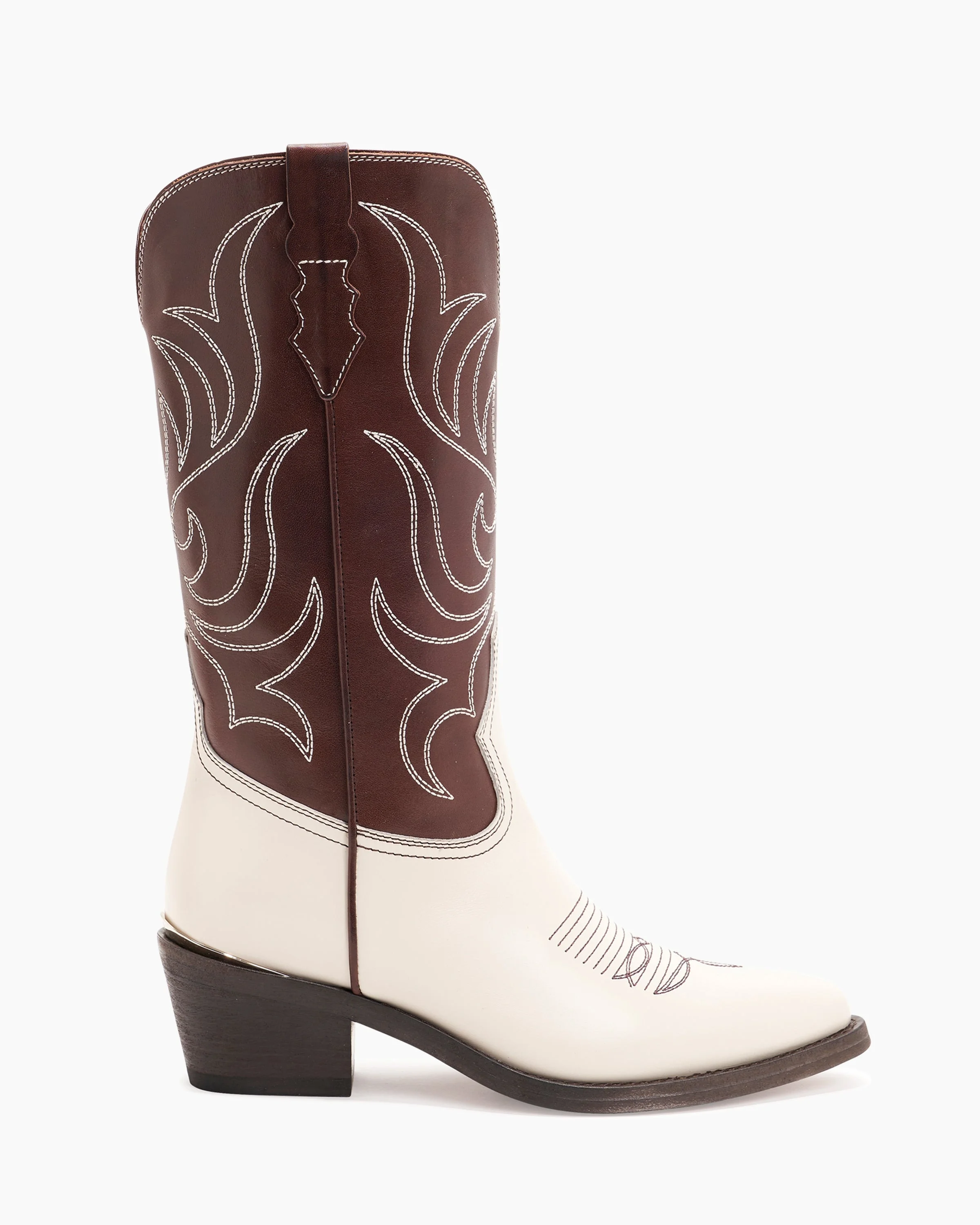A striking two-tone brown and cream leather cowboy boot with contrast top stitching. PRODUCT DESCRIPTION Pull on classic cowboy silhouette created from a croc-embossed calfskin upper, leather lining, and leather outsole with stitched welts. Heel height: 55mm/2.17”, 6mm padded insole. Featuring the signature Partlow plaque. Handcrafted in Italy. DETAILS AND CARE Brush off any dust or dirt with a soft bristle brush or soft cloth. Store boots in protective dustbags provided between wearings.