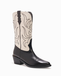 A striking two-tone black leather and white canvas cowboy boot with contrast top stitching. PRODUCT DESCRIPTION Pull on mid-calf boot. Calf and canvas upper with embroidered detail. 55mm/2.16" heel height. 6mm padded insole. Leather lining. Leather outsole with stitched welt. Signature Partlow plaque. Handcrafted in Italy. DETAILS AND CARE Brush off any dust or dirt with a soft bristle brush or soft cloth. Store boots in protective dustbags provided between wearings.