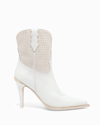 A flawless white-on-white heeled ankle boot with gold-tone micro studs. PRODUCT DESCRIPTION Pull on ankle boot. Calf and suede upper with micro studs. 95mm/3.75" heel height. 6mm padded insole. Leather lining. Leather outsole with stitched welt. Signature Partlow plaque. Handcrafted in Italy. DETAILS AND CARE Brush off any dust or dirt with a soft bristle brush or soft cloth. Store boots in protective dustbags provided between wearings.