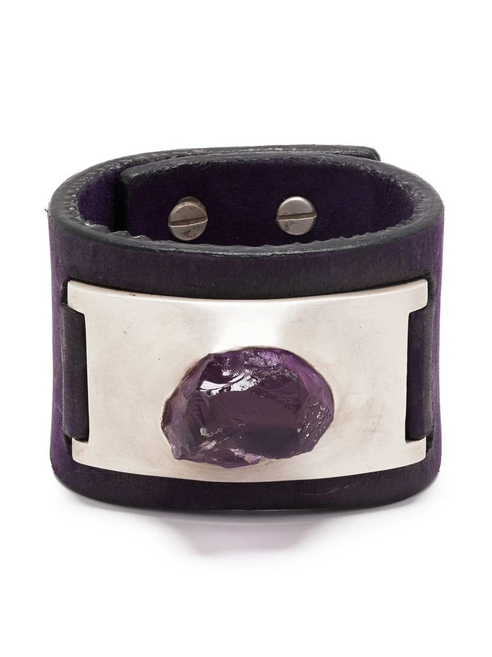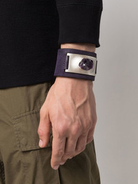 Amulet amethyst cuff bracelet purple calf leather-amethyst-silver plated brass polished finish amethyst snap-fit fastening Imported SIZE & FIT Model measurements Height 6 ft 2 in(1.89 m) Bust/Chest 37.79 in(96 cm) Hips 37 in(94 cm) Waist 29.92 in(76 cm) Measurement TOTAL LENGTH 8.66 in(22 cm) WIDTH 1.96 in(5 cm)