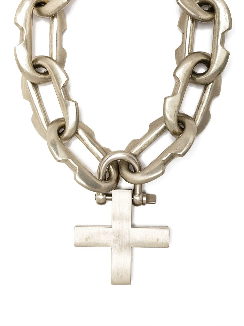 Massive Deco Link necklace silver bronze chain-link detailing hook-clip fastening cross pendant Imported SIZE & FIT Model measurements Height 6 ft 2 in(1.87 m) Bust/Chest 38.18 in(97 cm) Hips 36.61 in(93 cm) Waist 29.13 in(74 cm)