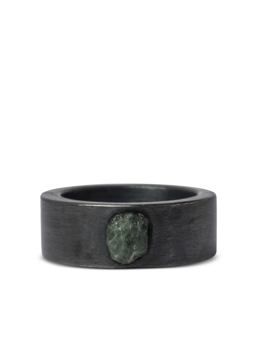 Sistema ring Highlights - Black - Sterling silver - Oxidised finish - Chunky band - Bezel-set green sapphire - Normal everyday use and external agents may reduce the lustre of gemstones and gold surfaces. to maintain, use specific, non-abrasive products specially meant for cleaning jewellery. Imported SIZE & FIT Measurement Band Width 0.35 in(0.9 cm)