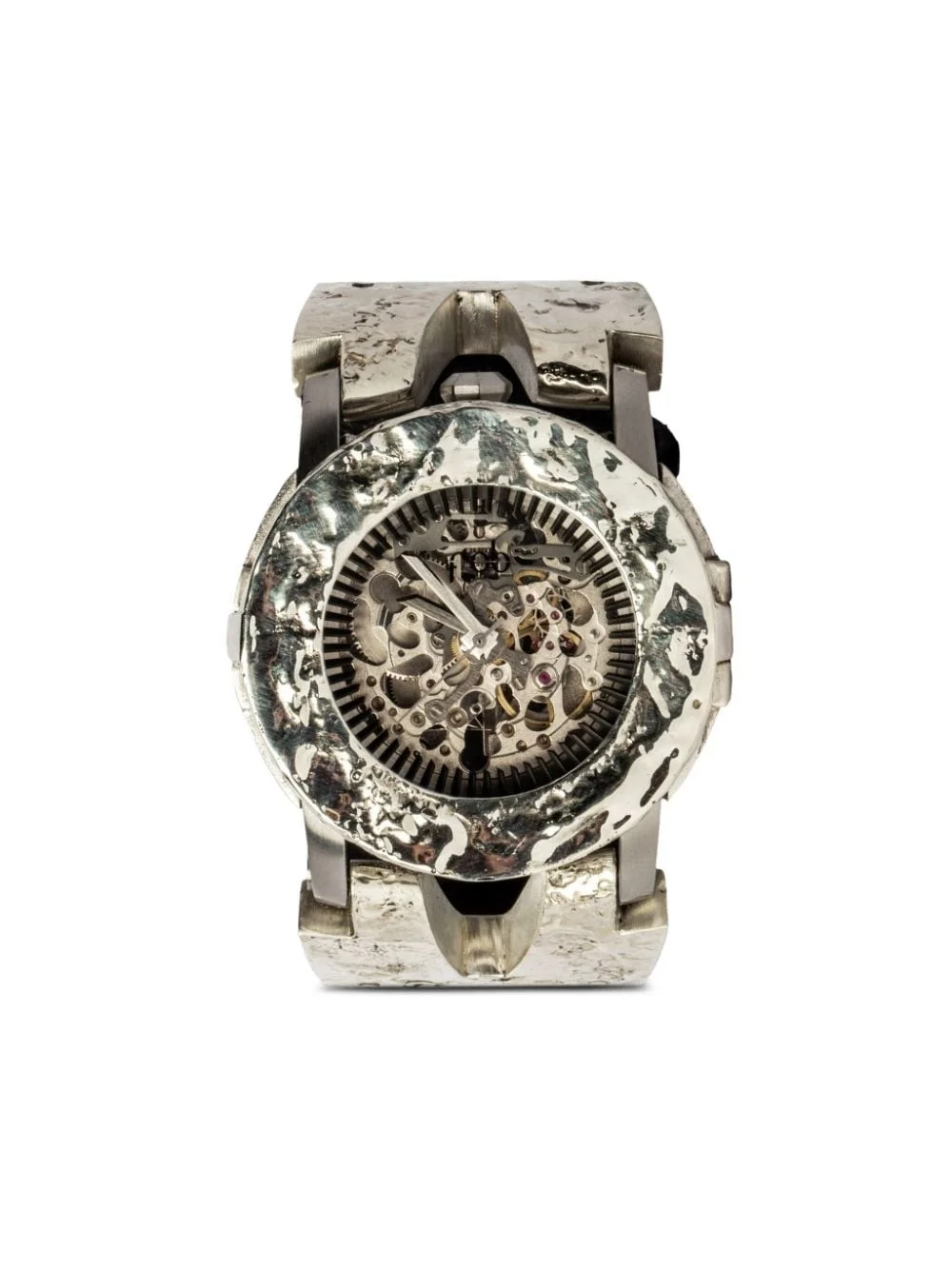 x Fob Paris #6 42mm Highlights - 42mm - 10kt white gold-plated sterling silver - Miyota 8n24 automatic skeleton movement 21 jewels - Round face - Skeleton dial - Baton hands - Sapphire glass - Anti-reflective coating - Skeleton case back - Black - Leather strap - Pin-buckle fastening - 21,600 vibrations per hour - 40-hour power reserve - Water resistance up to 50m/5 atm Imported SIZE & FIT Measurement CIRCUMFERENCE 0.7 in(1.8 cm) DIAMETER 1.62 in(4.1 cm) WIDTH 1.18 in(3 cm)