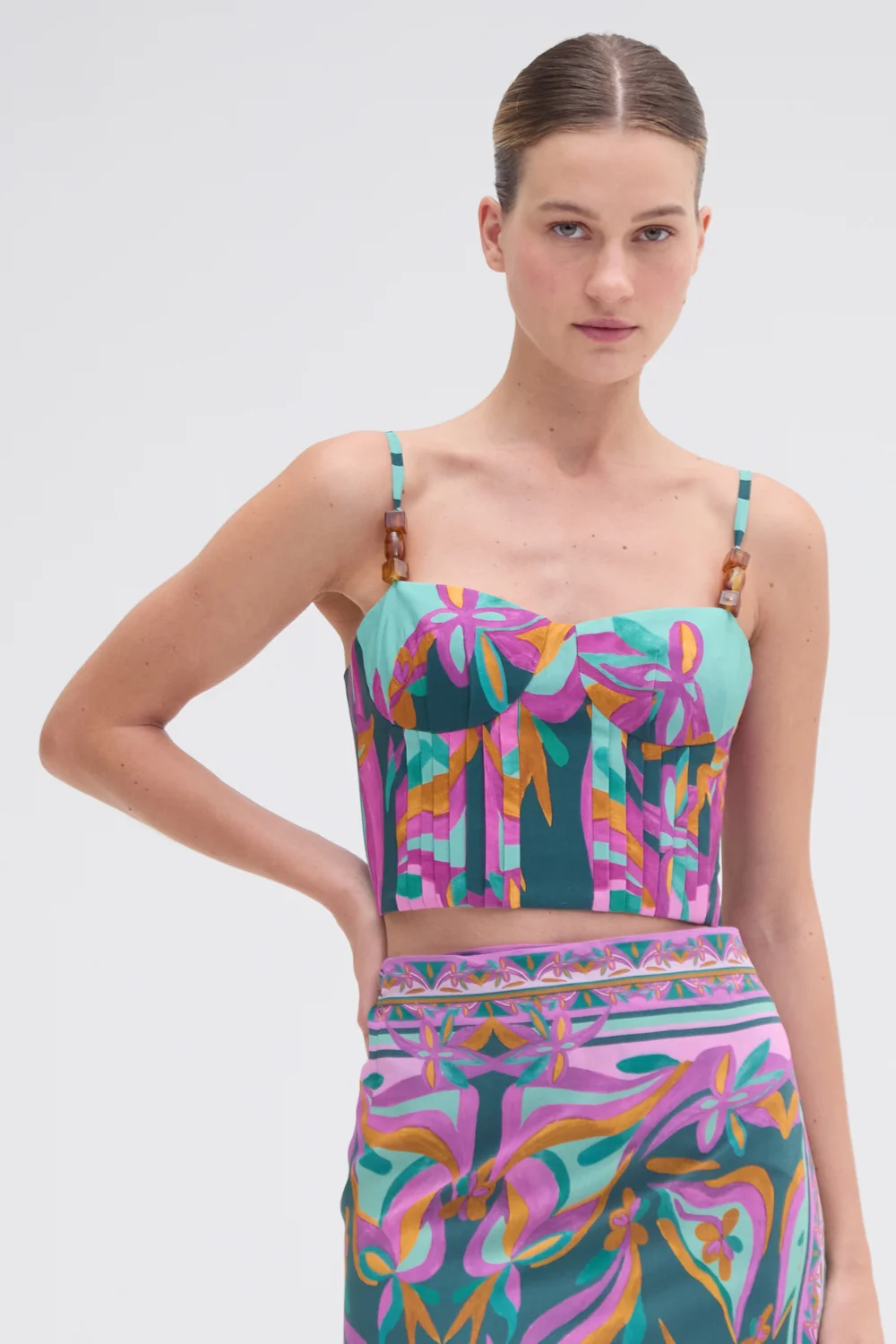 This cropped top features our new Aljezur pattern, inspired by Portuguese Hand Painted Tiles, echoing the elegance of Azulejos and the beaches of Aljezur, with a corset style design and beading along the adjustable straps. Concealed back zipper closure. Made in China. 100% Viscose. TOP30870US.