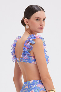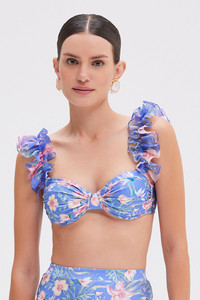 Playful and feminine, this floral bikini top features a twisted front, underwire support, and statement ruffled straps for a romantic touch. Designed for both style and comfort, it pairs perfectly with the matching bottoms for a standout swim look. Made in Brazil. 100% polyester. TOB32438