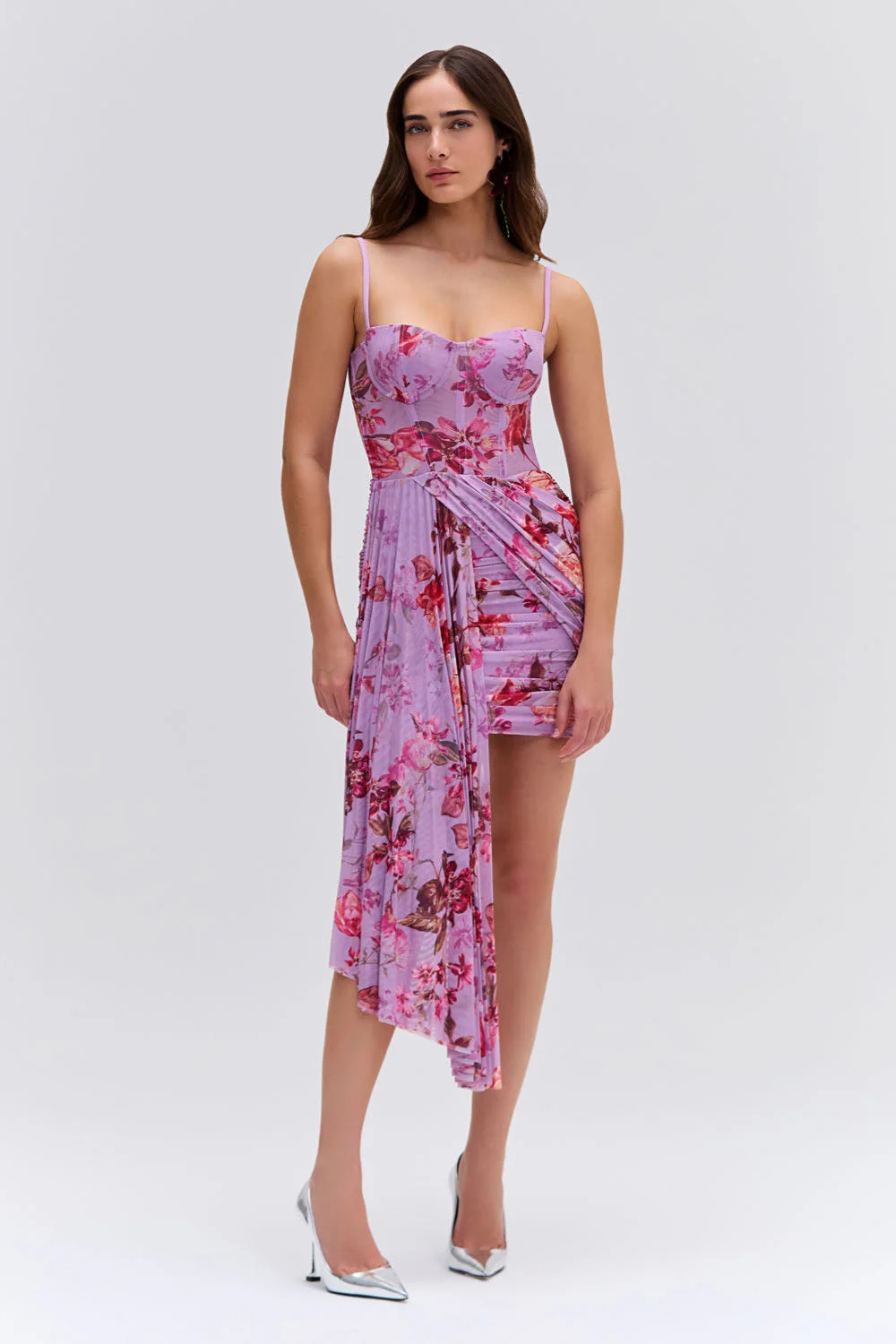 ALL SALE ITEMS ARE FINAL SALE. NO EXCHANGES OR RETURNS. Floral Haze Bustier Mini Dress is crafted from a stretch tulle fabric. The bodice features a corset bralette detail and a sweetheart neckline. Mini-skirt with side-draping. Straps are adjustable. Back zipper closure, true to size. Made in Brazil. 95.5% Polyester 4.5% Elastane. VEC30001US.