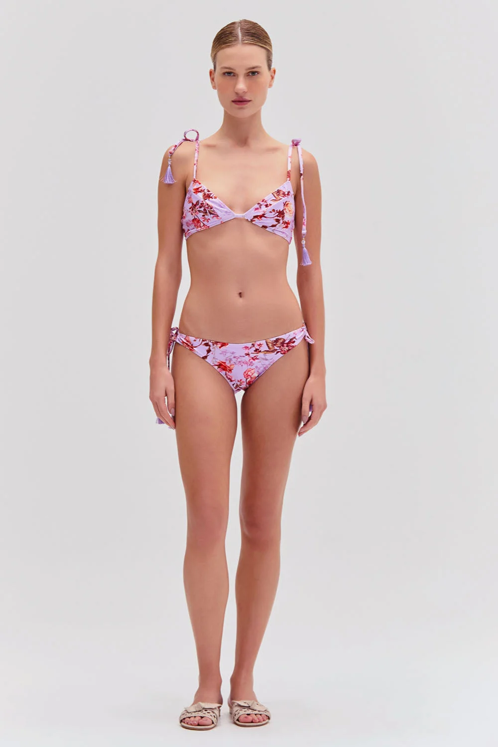 ALL SALE ITEMS ARE FINAL SALE. NO EXCHANGES OR RETURNS. Classic string bikini shape in our romantic print floral haze in lycra fabric. Adjustable fit through back and halter ties with tassel detail. Fully lined. Runs true to size. Made in Brazil. 82% Polyamide 18% Elastane. CAB30622US.