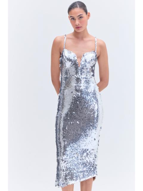 This midi dress features a plunging halter neckline with shell embroidery throughout into a fitted crochet skirt with flattering side cut outs. Built in bodysuit for partial lining and layered fringe trims along the hemline. Open back design with a tie at the neck and clasp at the mid back. Made in China. Crochet 100% Cotton. Lining 81% Polyamide 19% Elastane. VEM31837.