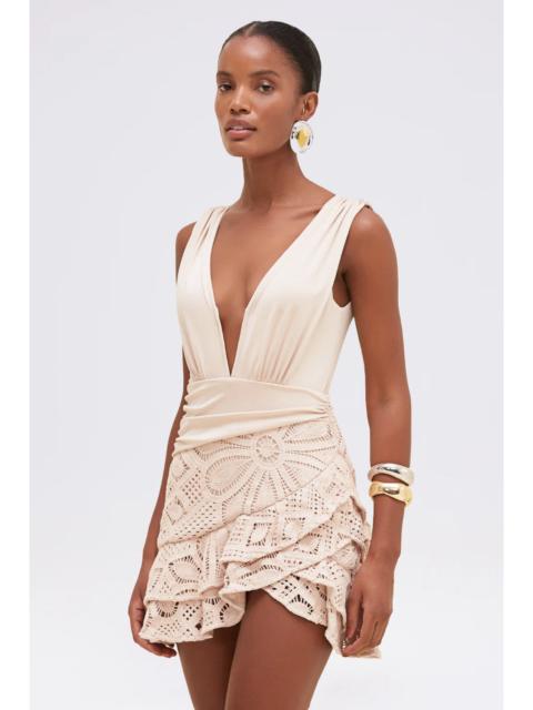 This mini dress features a plunging V neckline with a flattering waist ruching detail into a crochet fabric ruffled skirt. Open back design with a tie closure along the top of the back. Made in China. 100% Cotton. Lycra 85% Polyamide 15% Elastane. Lining 81% Polyamide 19% Elastane. VEC32010.