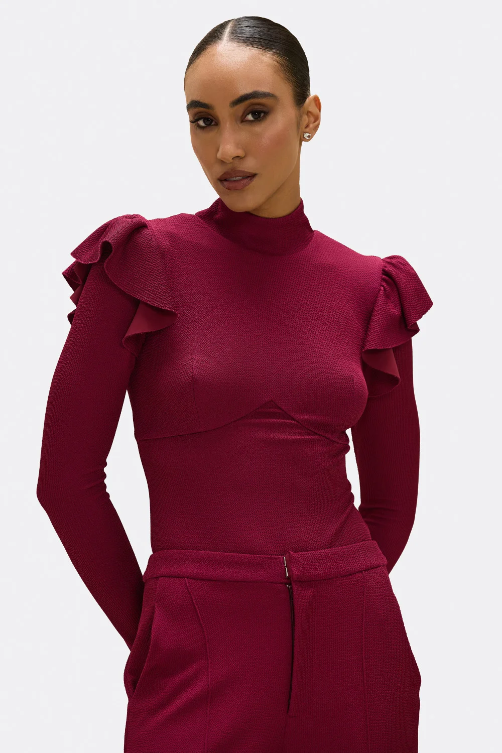 The Grace Knit Long Sleeve Bodysuit is a refined statement piece crafted in rich burgundy knit. It features sculptural ruffle accents at the shoulders and a subtly contoured bustline that adds a touch of structure. Designed to hug the body, it’s finished with long sleeves and a high neckline. Necklace is not included. Made in Brazil. Model wears size Small. BOD32736