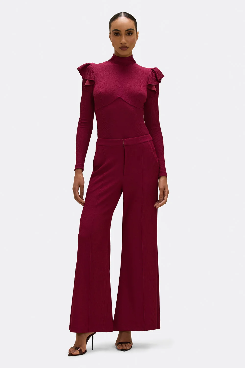 Crafted from knit, these high-waisted pants feature a sleek, elongated silhouette with subtle front seams for added structure. The flared leg creates fluid movement and a touch of retro elegance, while the tailored waistband and concealed closure ensure a clean, flattering fit. Made in Brazil. Model wears size 4. CAL32614