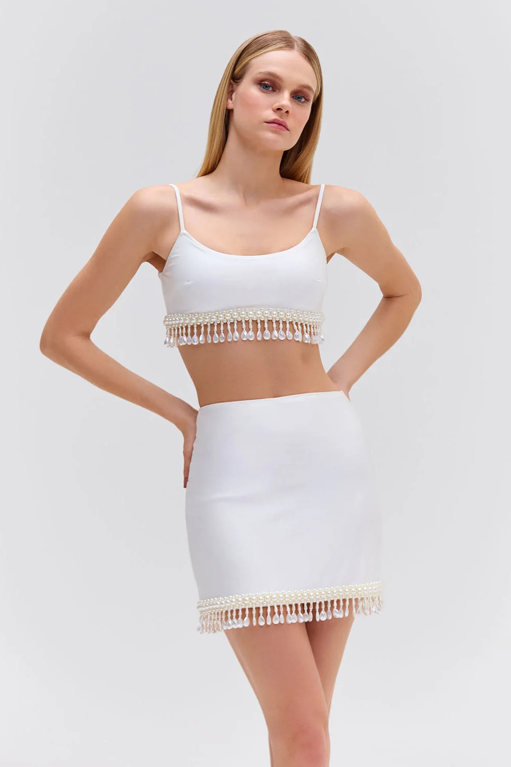 This style was paired with the Hand-Beaded Cropped Top and can be worn as a set. This mid-rise mini skirt features a hand-beaded trim, a concealed back zipper closure and is fully lined. Runs small. Model is wearing a size small. Made in Brazil. 85% polyamide, 15% elastane. SAC25466US.
