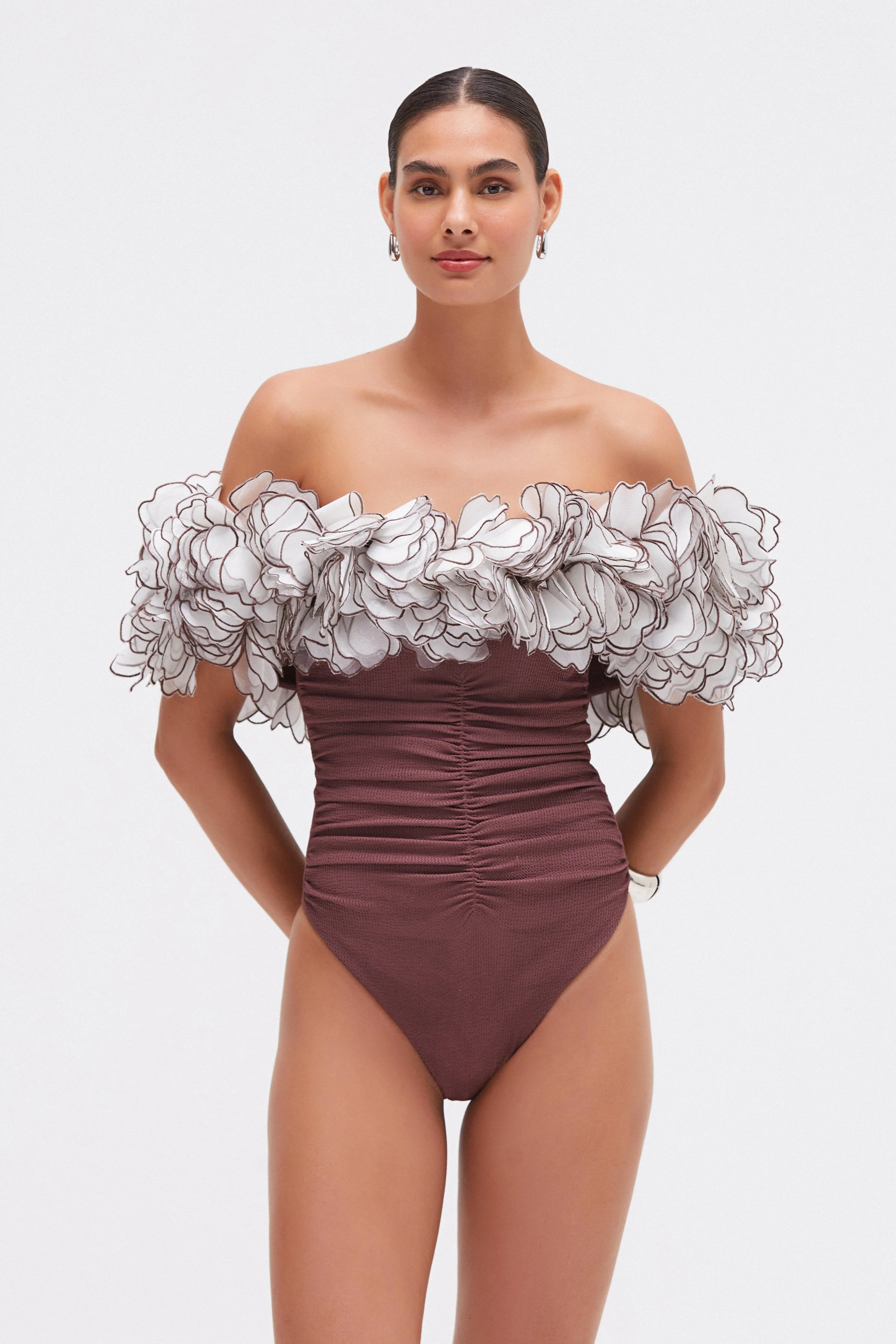 This bodysuit was look 11 in our Spring 25 Runway Collection, it features a flutter detail off the shoulder design with a ruching detail on the bodice, that takes up to 13 hours to be finished. Concealed back zipper closure. EMBROIDERY TIME: 13 hours Made in Brazil. 96% Polyamide 4% Elastane. Flowers 100% Polyester. BOD31590