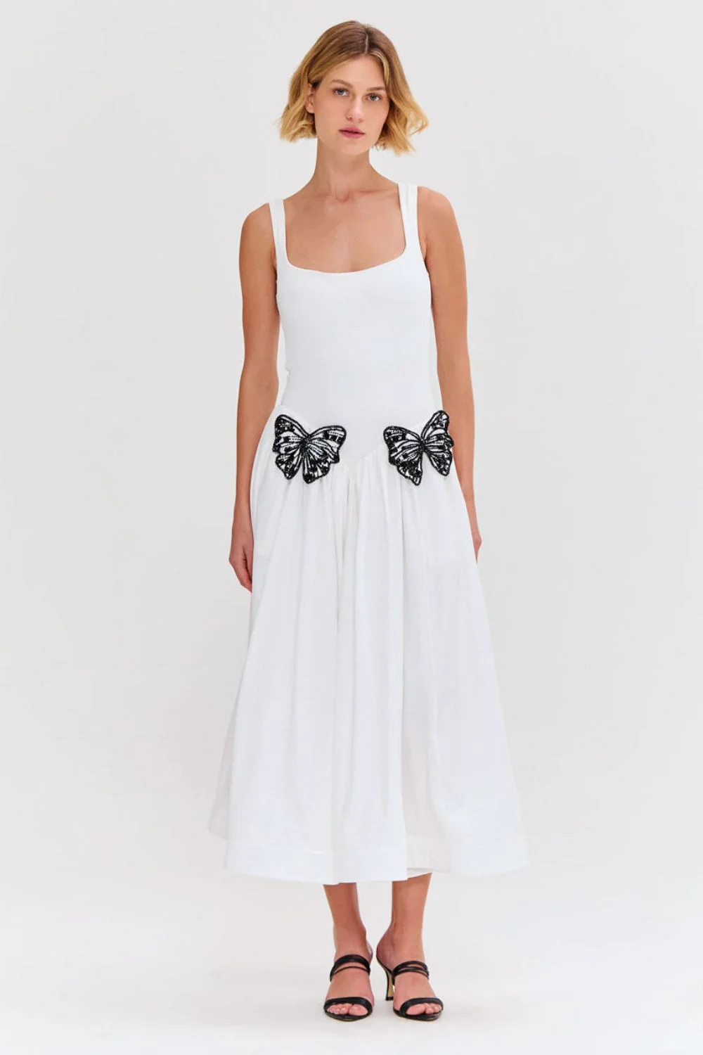 This midi dress features our Merian Knit material, with a square neckline and fitted bodice into a drop waist voluminous pleated skirt with hand beaded butterfly appliques. Made in Brazil. Bodice 96% Polyamide 4% Elastane. Skirt 97% Cotton 3% Elastane. VEM31789