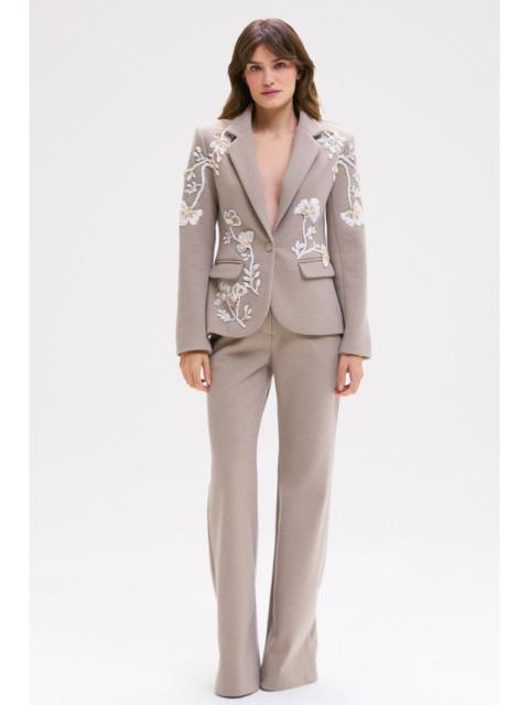 Gray tailored pants featuring a classic pinstripe pattern. This piece combines structure and sophistication with a subtle touch of shine. Designed with a wide-leg silhouette and an elegant drape for a refined finish. Made in Brazil. Model wears size 4. CAL32067