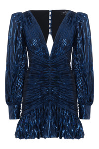 Crafted in a luminous blue pleated fabric, it features a deep V-neckline and bold shoulders that create an empowered silhouette. The ruched detailing through the bodice enhances the shape, while the flounced hem adds a playful, flirty finish. Long sleeves with buttoned cuffs and a small back cutout complete the look with elegance. Perfect for festive nights and special events Made in Brazil. Model wears size 4. VEC32509