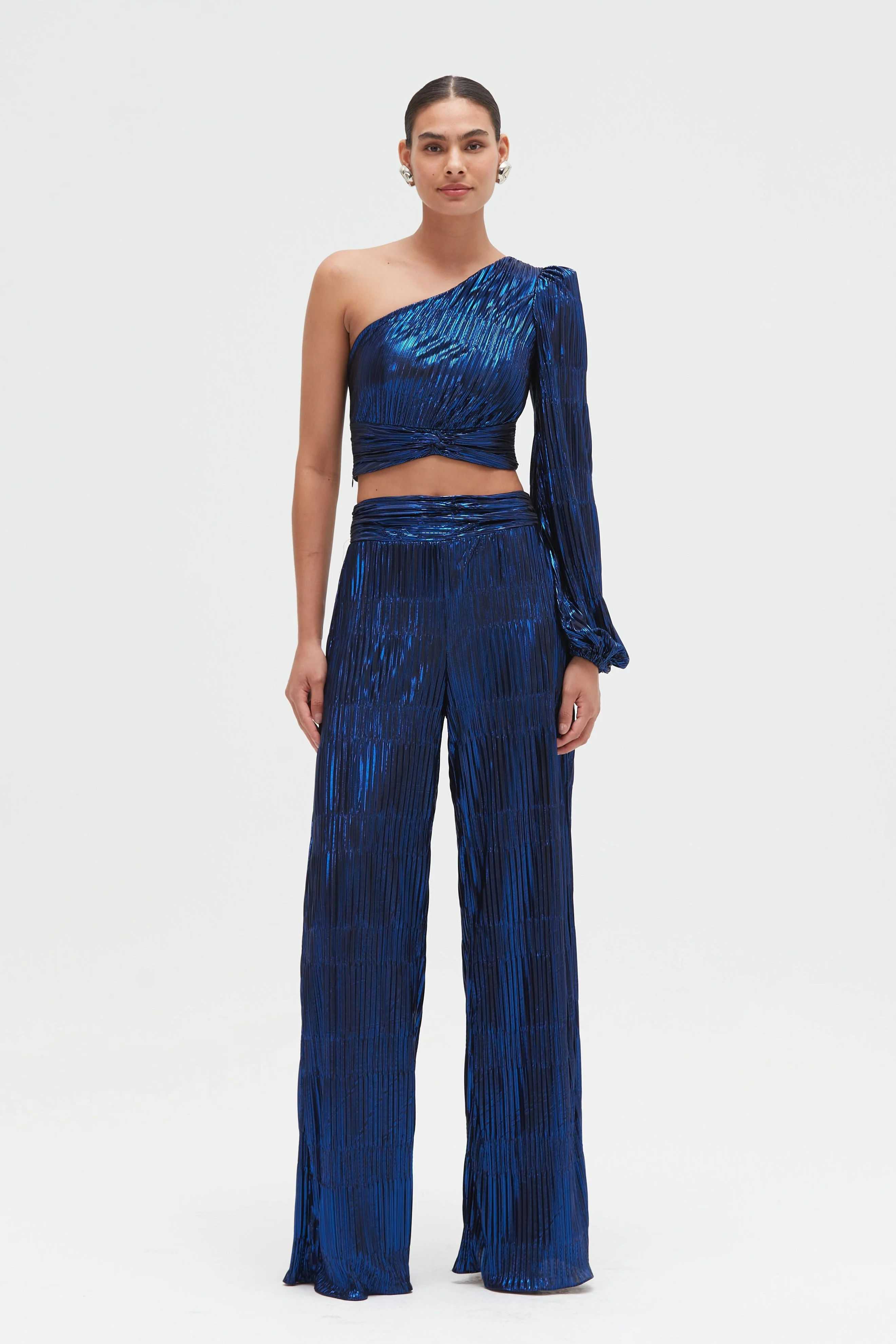 Crafted from light-catching metallic plisse, this navy blue one-shoulder top brings dramatic elegance to any look. It features a fluid long sleeve gathered at the wrist and a sculptural knotted hem that cinches at the waist, accentuating the silhouette with a touch of modern flair. Made in Brazil. Model wears size 4. TOP32577