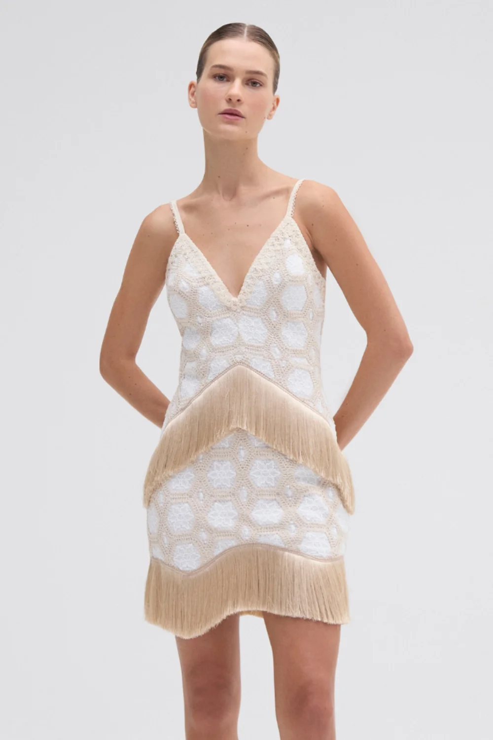 This mini dress features a plunging V neckline with lace trim, a fitted bodice of natural crochet with fringe detailing throughout and along the hemline. Adjustable lace straps. Made in Brazil. 60% Cotton 40% Polyester. VEC30814US