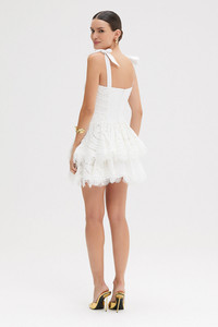 Delicate and feminine, this white mini dress features a smocked lace bodice with a sweetheart neckline and soft ribbon straps. The flared skirt is finished with scalloped lace detailing, adding romantic texture and movement—perfect for bridal events, summer celebrations, or a flirty getaway look. Made in Brazil. 100% Cotton. VEC32480