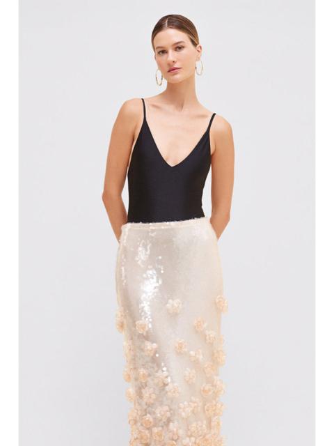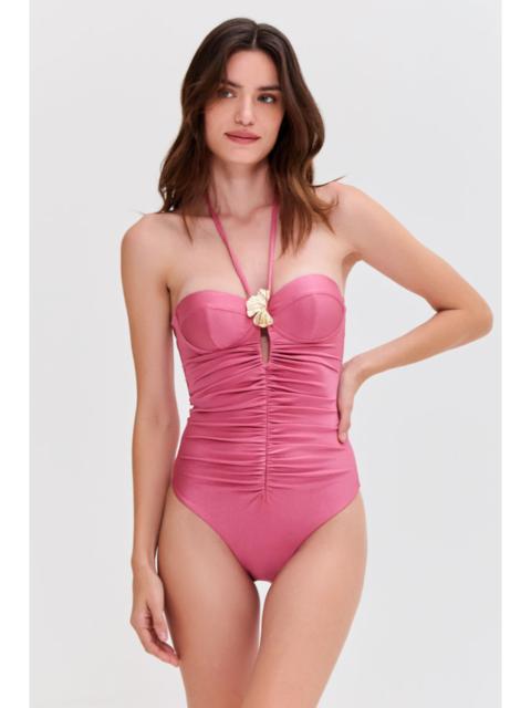 This one piece features a plunging V neckline with structured shoulders and sheer lace balloon sleeves into a solid lycra bodice with belt detail and special hardware at the center. Open back design with tie closure at the top. Made in Brazil. Sleeves 93% Polyamide 7% Elastane. Lycra 85% Polyamide 15% Elastane. BOB31670.