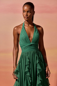 Effortlessly elegant, this green halter gown is a celebration of movement and femininity. Crafted from a lightweight, flowy fabric, it features a plunging neckline and a flattering ruched waist that beautifully contours the silhouette. Cascading ruffles add a playful touch and graceful fluidity as you walk. The open back, tied delicately at the neck, enhances its sultry, summer vibe — perfect for a sunset cocktail in Rio or an alfresco soiree by the sea. Made in Brazil. 96% Polyester. 4% Elastane. VEL32605