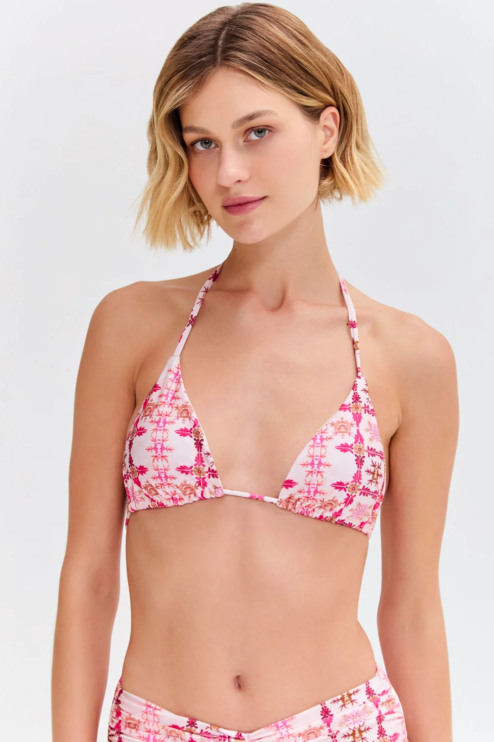 This top features our Sintra Flower print with a classic triangle bikini top design, tie closure at the neck and mid back with beaded detail. Made in Brazil. 82% Polyamide 18% Elastane. TOB31758.