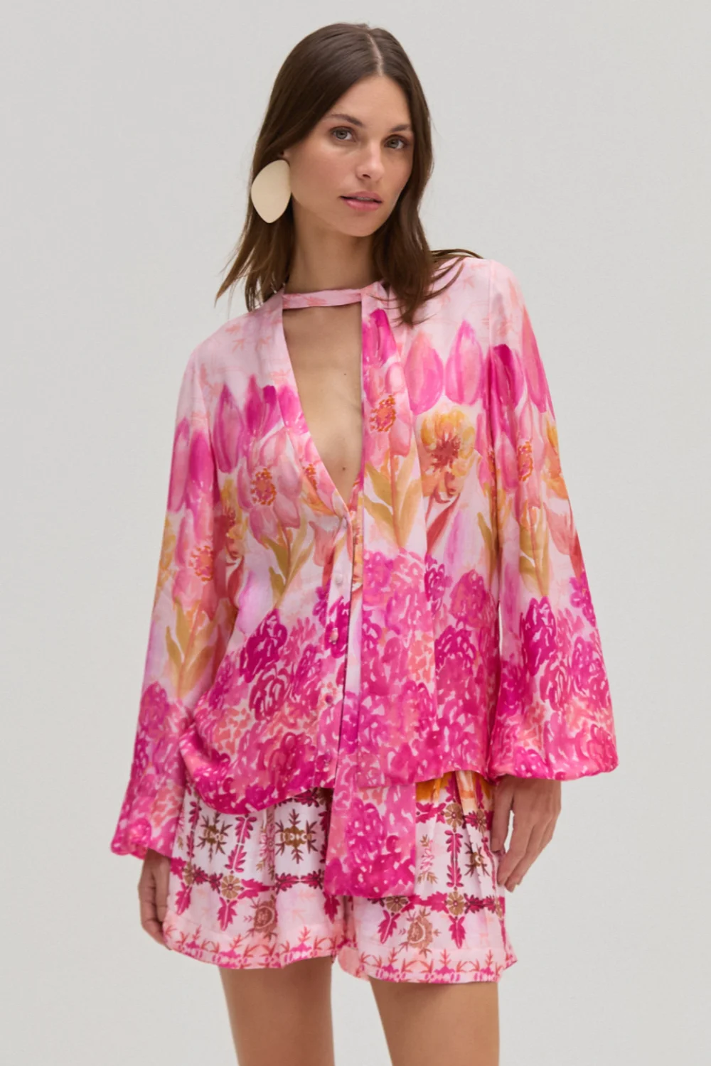 This shirt features our Sintra Flower print for a loose fitting design, a plunging V neckline with a tie detail at the neck and Long loose sleeves coming to a cinch at the wrists. Size chart based on the garment's seam measurements, not body measurements. Made in Brazil. 100% Viscose. CAM31416US.