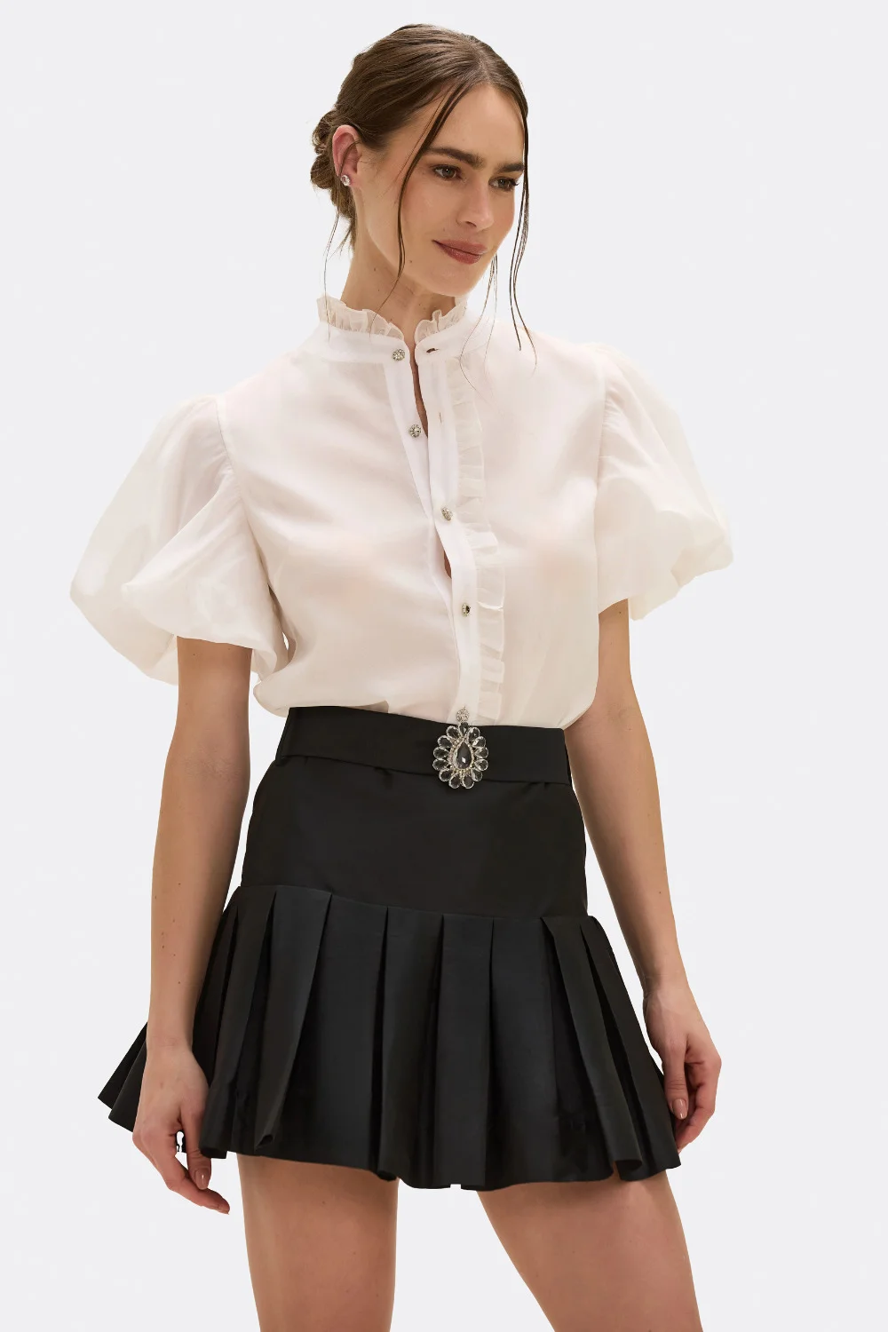 Delicate and structured, this puff-sleeve shirt is crafted from crisp taffeta and features romantic details throughout. Ruffles trace the button placket and high collar, while crystal-embellished buttons add a refined sparkle. A feminine staple that balances volume with classic tailoring. Made in Brazil. Model wears size 4. CAM32524