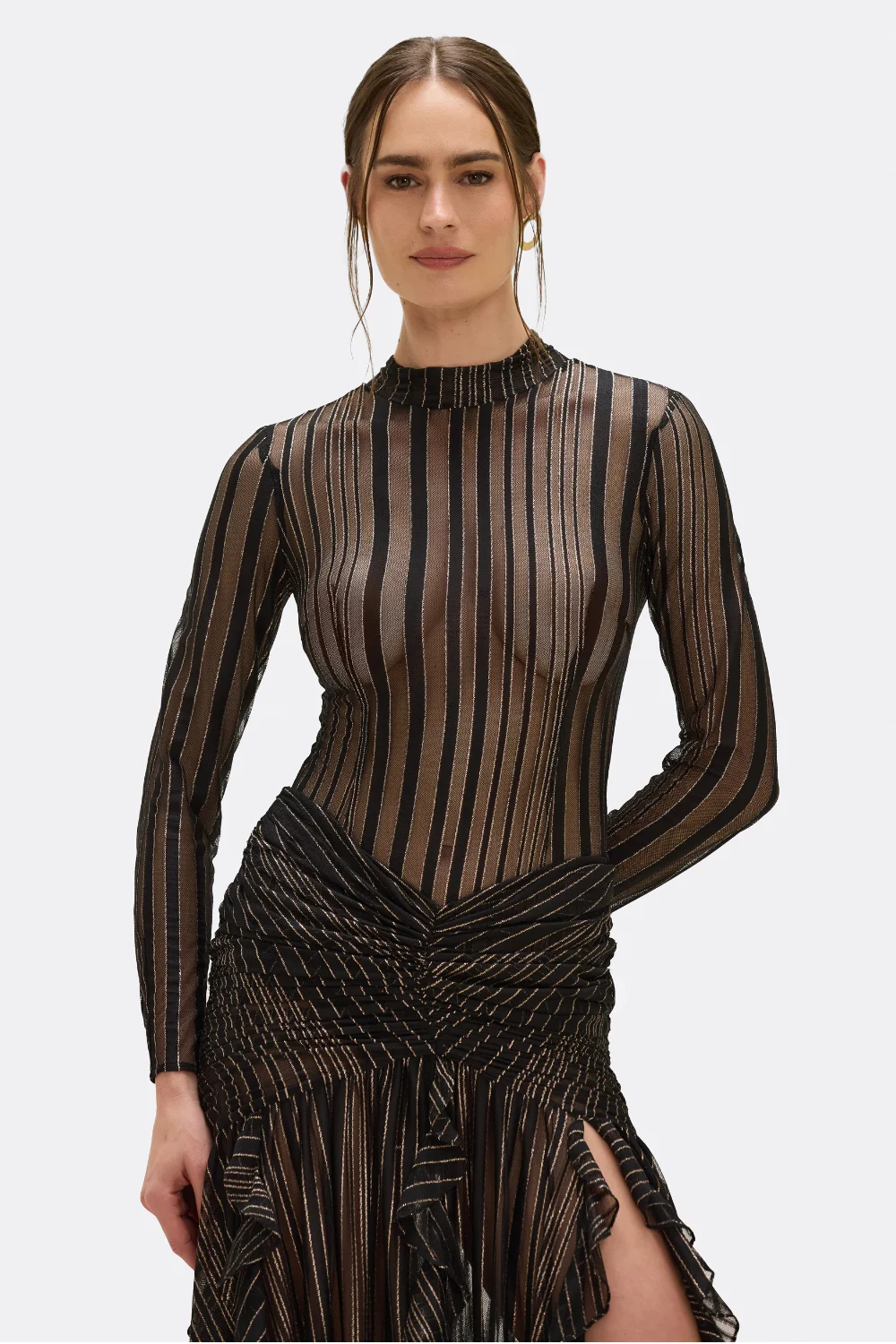 This long-sleeve bodysuit is crafted from sheer mesh with shimmering metallic stripes, creating a bold play of transparency and shine. Designed with a high neckline and a second-skin fit, it brings a daring yet sophisticated edge, perfect for layering or wearing as a statement evening piece. Made in Brazil. Prism Lurex. BOD32754