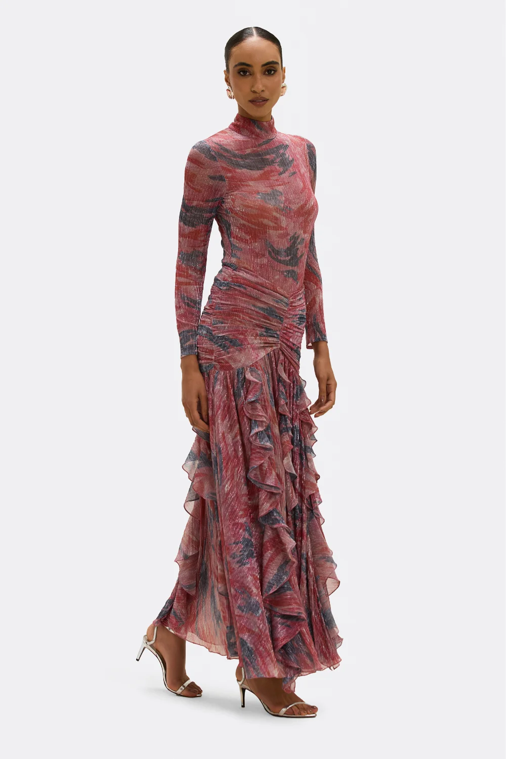 Crafted in semi-sheer pleated fabric, this maxi skirt features an abstract print in warm, earthy tones. The high waistline is ruched and detailed, while the thigh-high slit adds fluidity and movement with every step. A standout piece from the Fall NYFW 2026 collection, it balances comfort and drama with ease. Made in Brazil. Model wears size 4. SAL32750
