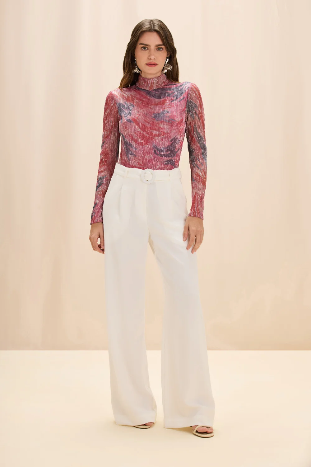 Made from sheer stretch mesh with a metallic shine, this printed bodysuit features a fitted silhouette, mock neckline, and long sleeves. Finished with a snap closure at the base and a concealed back zipper. Made in China. Model wears size 4. BOD32783