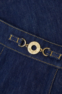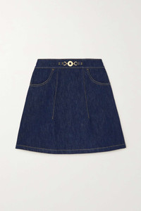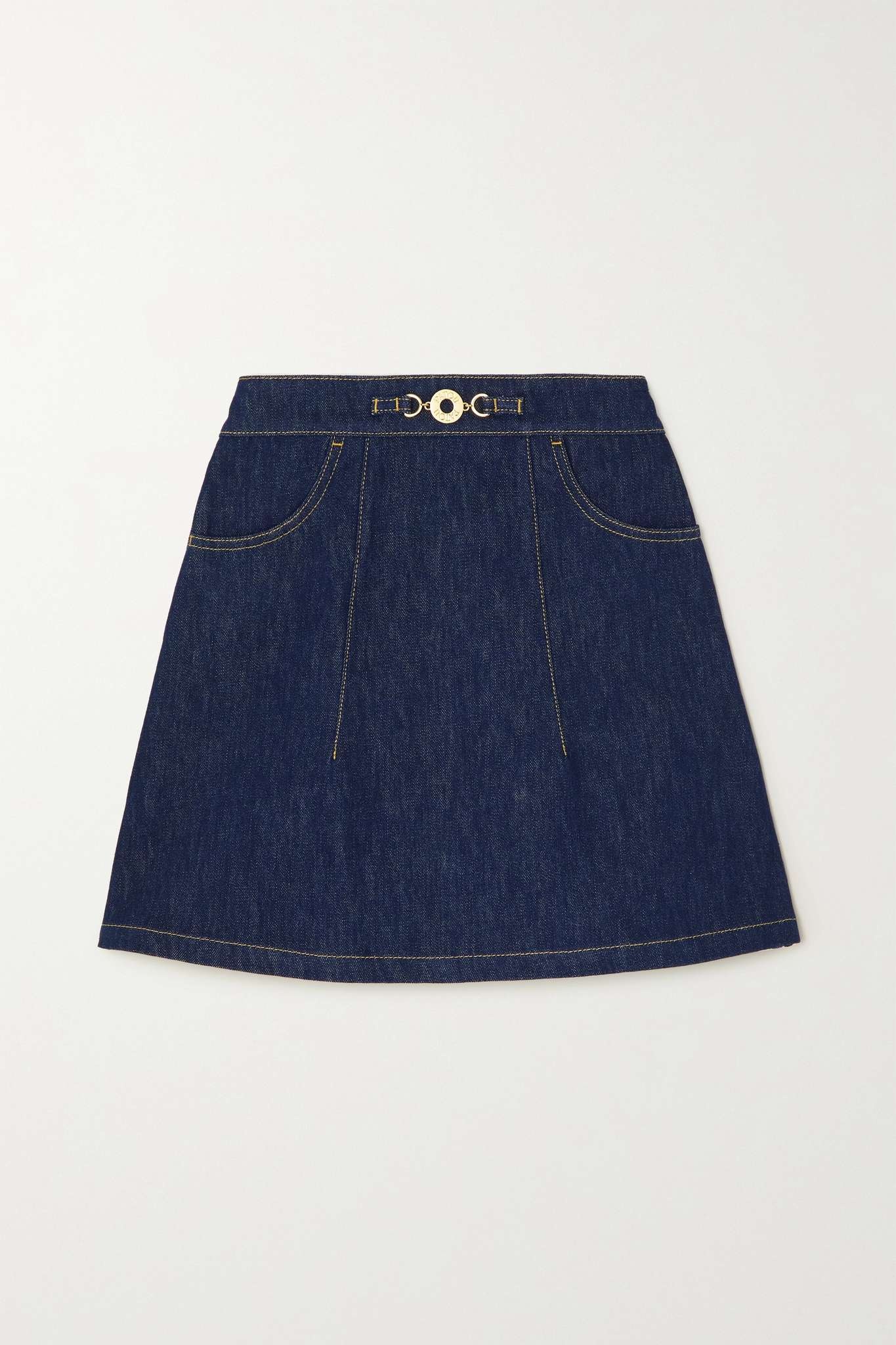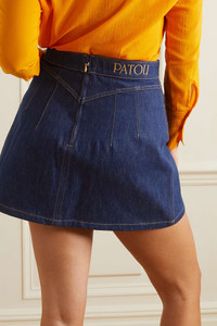 EDITORS'NOTES Patou loves to reference designs from bygone eras. Inspired by the '60s, this mini skirt is made from sturdy dark-blue denim with a logo plaque at the waist and gold topstitching tracing the A-line shape. Style yours with a fitted white tank and sneakers. SIZE & FIT - Fits true to size, take your normal size - Mini-length, designed to be worn at the waist - Mid-weight, slightly stretchy fabric - Model is 180cm/ 5’11” and is wearing a FR 44 DETAILS & CARE - Dark-blue denim - Concealed hook and zip fastening at back - 92% cotton, 8% polyester - Designer wash: Rodeo Blue
