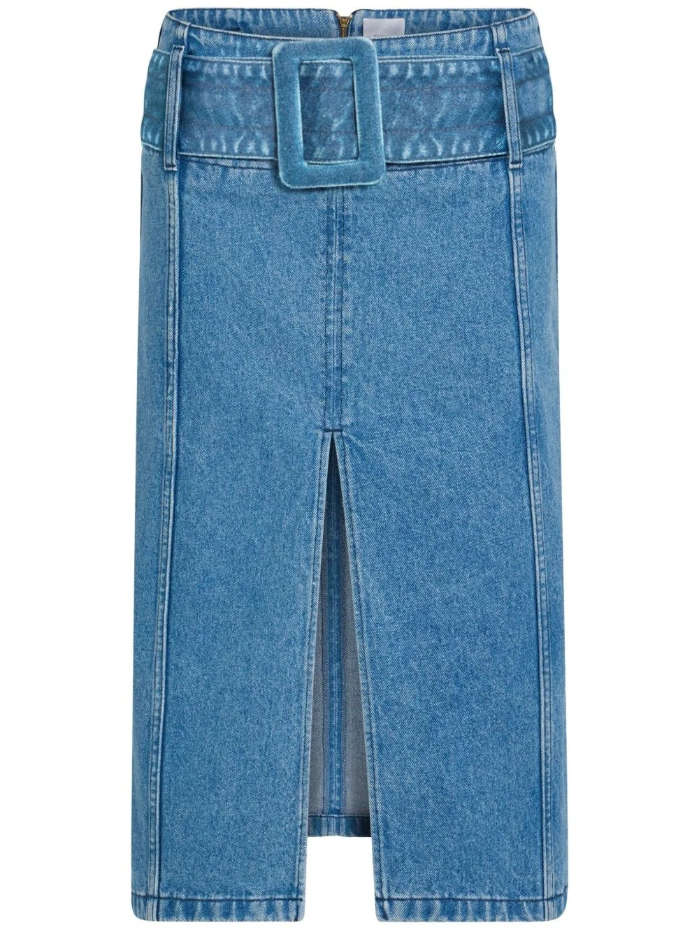 belted denim midi skirt Highlights - Blue - Rear zip fastening - Two side inset pockets - Front slit - Belt loops Imported Composition Organic Cotton 100%