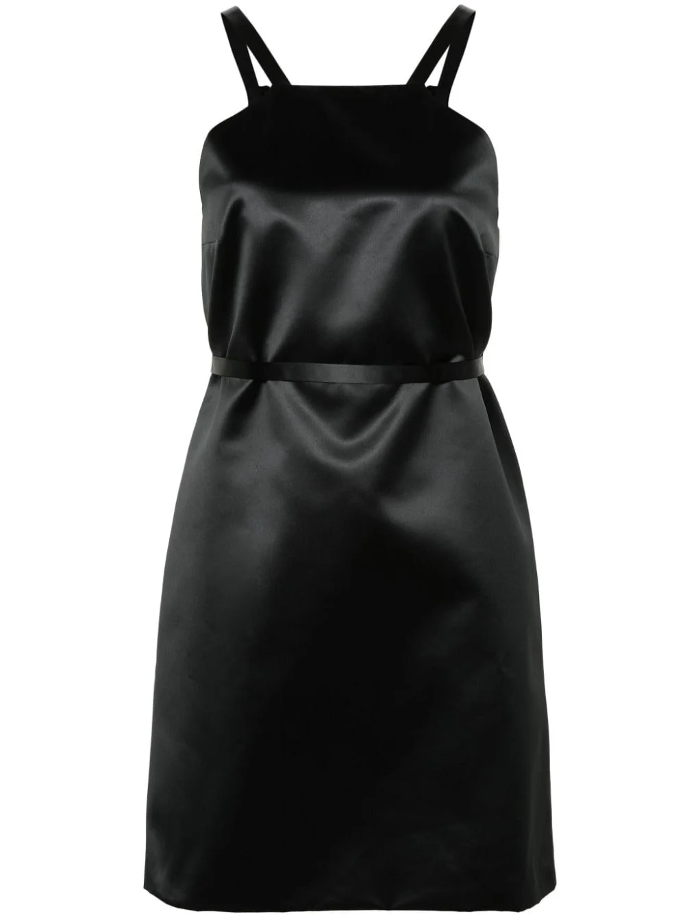 belted satin mini dress Highlights - Black - Duchess satin weave - Thin straps - Sleeveless - Square neck - Dart detailing to the chest - Belt loops - Detachable and adjustable waist tie - Thigh-length - Bow detailing to the rear - Authenticity qr code - Full lining - Straight hem - Concealed rear zip fastening Imported Composition Polyester 100% SIZE & FIT Model measurements Height 5 ft 10 in(1.77 m) Bust/Chest 29.92 in(76 cm) Hips 34.25 in(87 cm) Waist 23.62 in(60 cm) FittingInformation Designed for a slim fit that sits just away from the body offering a close yet comfortable fit The adjustable tie waist gives a more adaptable and personalised fit Made from a lightweight non-stretch fabric This piece fits true to size – take your usual size