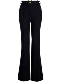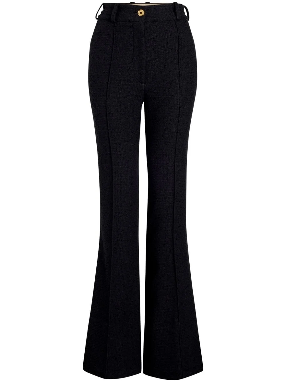 flared tweed trousers Highlights - Black - Organic cotton - Tweed - High-rise - Belt loops - Pleat detailing - Front button and zip fastening - Flared - Slip pockets to the sides Imported Composition Wool 53%, Organic Cotton 41%, Polyamide 6% SIZE & FIT Measurement FRONT RISE 12.59 in(32 cm) INSIDE LEG 35.82 in(91 cm) BACK RISE 15.35 in(39 cm) HIPS 33.07 in(84 cm) Hem Width 11.81 in(30 cm) WAIST 27.55 in(70 cm)
