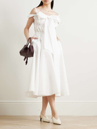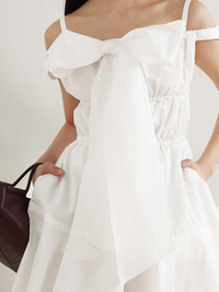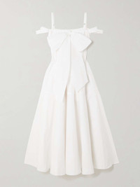 EDITORS'NOTES There's no better way to usher in spring than with a white dress, especially one as pretty as Patou's 'Cocktail' style. It’s made from crisp poplin that's shirred through the bodice and detailed with a flouncy bow. Style yours with barely-there sandals. SIZE & FIT Model measurements: - Fits true to size, take your normal size - Designed to be slightly fitted at the bust and waist, loose at the hip - Fully adjustable shoulder straps - Elasticated at the waist for a flexible fit - Mid-weight, non-stretchy fabric - Model is 175cm/ 5'9" and is wearing a FR 36 - Bust: 81cm/ 31.9" - Waist: 65cm/ 25.6" - Hip: 82cm/ 32.3" DETAILS & CARE - White poplin - Slips on - 100% polyester - Hand wash
