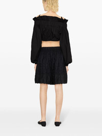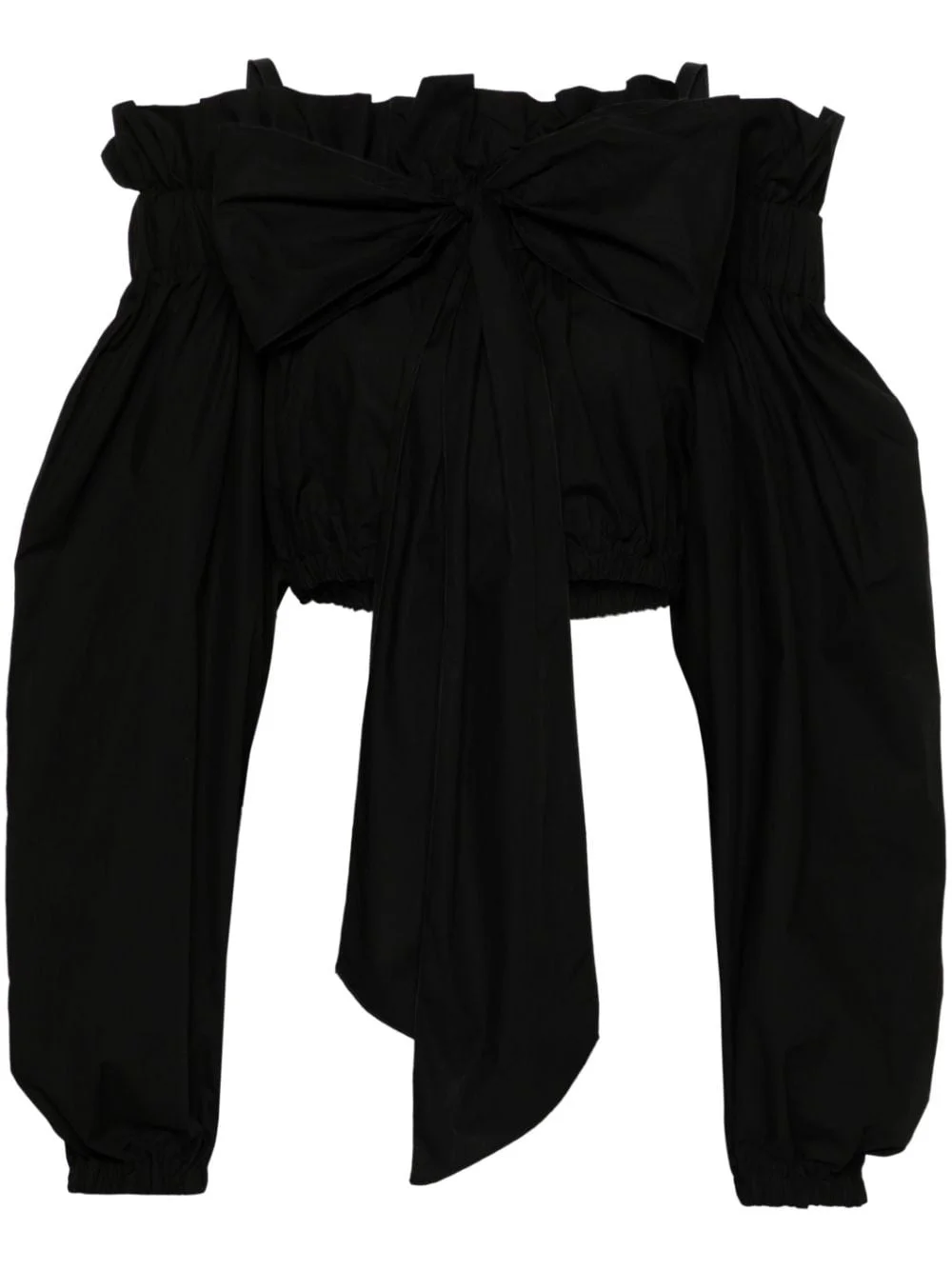 bow-detail crop top Highlights - Black - Cotton - Poplin texture - Ruffled trim - Oversize bow detail - Spaghetti straps - Off-shoulder - Elasticated band - Long sleeves - Elasticated cuffs - Elasticated hem - Cropped - Straight hem Imported Composition Cotton 100% SIZE & FIT Model measurements Height 5 ft 10 in(1.79 m) Bust/Chest 31.49 in(80 cm) Hips 35.03 in(89 cm) Waist 23.62 in(60 cm) Measurement CHEST 27.95 in(71 cm) SLEEVE LENGTH 27.55 in(70 cm) LENGTH 12.59 in(32 cm) FittingInformation Designed for a slim fit that sits just away from the body offering a close yet comfortable fit The adjustable shoulder straps allow for a preferred fit when worn Made from a midweight non-stretch fabric This piece fits true to size – take your usual size
