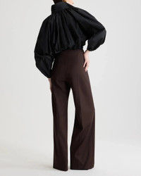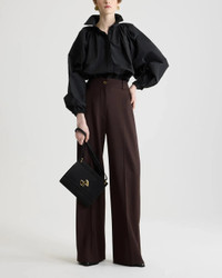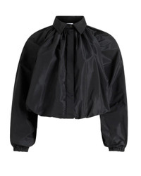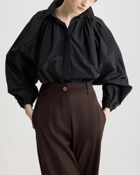 The Bubble Blouse in Recycled Faille in Black by Patou is a long-sleeve classic collared shirt featuring a bubble hem and balloon sleeves with a slightly cropped length. Perfect for a chic look at the office or an outing with friends.