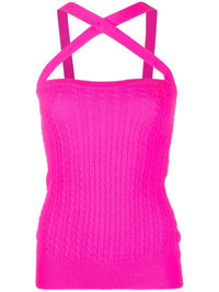 cable-knit halterneck top French label Patou's timeless yet bold take on garments punctuates its SS23 edit, as shown by this fuchsia knitted top. Spun from a delicate blend of wool and cashmere and woven into a cable-knit texture, this piece is elevated with crossover straps at the chest. Made in Italy Composition Wool 90%, Cashmere 10% SIZE & FIT Model measurements Height 5 ft 9 in(1.75 m) Bust/Chest 31.88 in(81 cm) Hips 33.85 in(86 cm) Waist 24.01 in(61 cm) FittingInformation This piece fits true to size. We recommend you get your regular size Cut for a slim fit Made with a mid-weight fabric Washing instructions Hand Wash