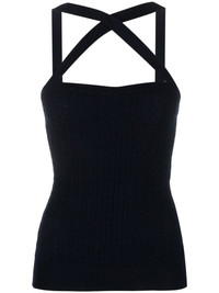 cable-knit halterneck top French label Patou's timeless yet bold take on garments punctuates its SS23 edit, as shown by this midnight blue knitted top. Spun from a delicate blend of wool and cashmere and woven into a cable-knit texture, this piece is elevated with crossover straps at the chest. Made in Italy Composition Wool 90%, Cashmere 10% SIZE & FIT Model measurements Height 5 ft 9 in(1.75 m) Bust/Chest 31.88 in(81 cm) Hips 33.85 in(86 cm) Waist 24.01 in(61 cm) FittingInformation This piece fits true to size. We recommend you get your regular size Cut for a relaxed fit Made with a mid-weight fabric Washing instructions Hand Wash