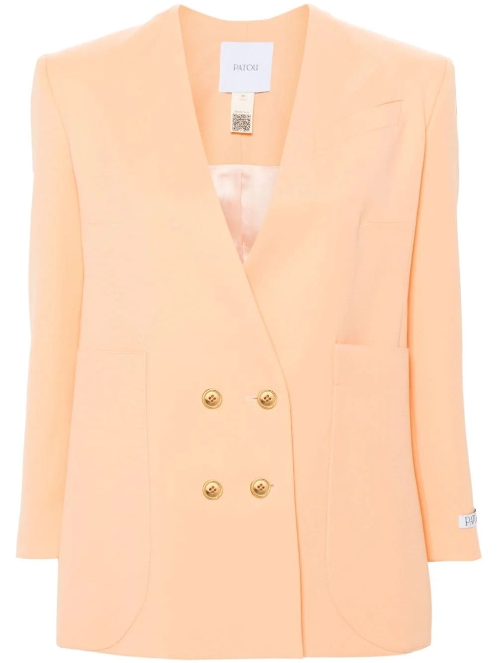 collarless double-breasted blazer Highlights - Light orange - Virgin wool blend - Twill weave - Collarless - V-neck - Shoulder pads - Chest welt pocket - Long sleeves with buttoned cuffs - Logo patch at the sleeve - Dart detailing - Two side patch pockets - English rear vents - Authenticity qr code - Full lining - Straight hem - Gold-tone buttons - Double-breasted button fastening Imported Composition Virgin Wool 97%, Elastane 3% SIZE & FIT Model measurements Height 5 ft 10 in(1.77 m) Bust/Chest 29.92 in(76 cm) Hips 34.25 in(87 cm) Waist 23.62 in(60 cm) FittingInformation Designed to be unstructured, offering a loose fit throughout The internal shoulder pads offer a structured shape Made from a midweight fabric This piece fits true to size – take your usual size