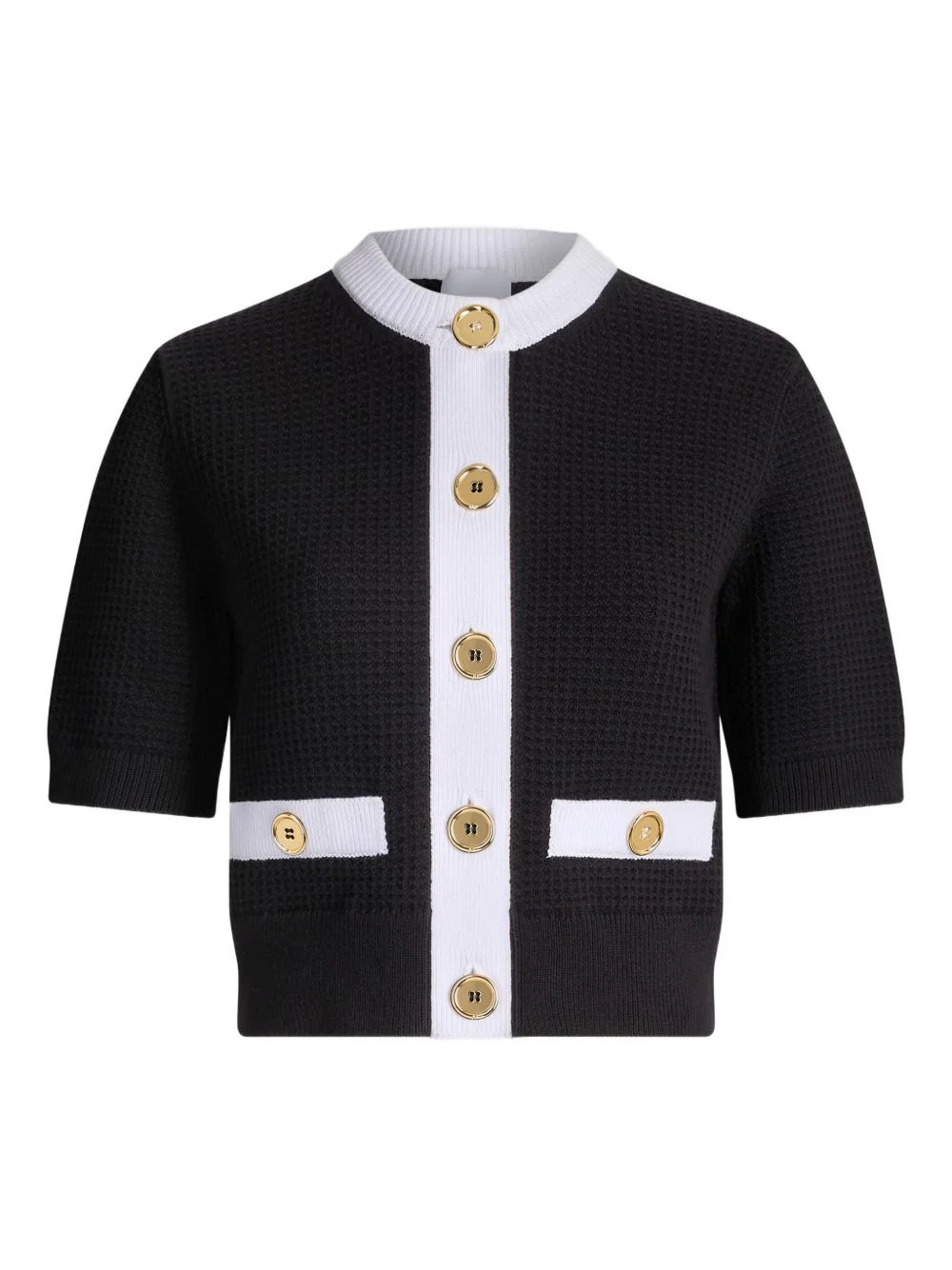 collarless textured top Highlights - Black - Textured knit - White trim - Button fastening - Short sleeves - Patch pockets Imported Composition Cotton 95%, Polyamide 4%, Elastane 1% Washing instructions Machine Wash