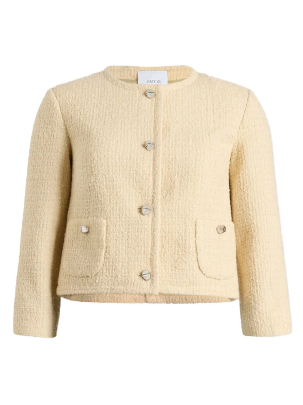 collarless tweed jacket Highlights - Pale yellow - Tweed - Button fastening - Patch pockets - Three-quarter sleeves - Round neck Imported Composition Outer: RWS Virgin Wool 100% Lining: Viscose 100% Washing instructions Dry Clean Only