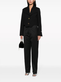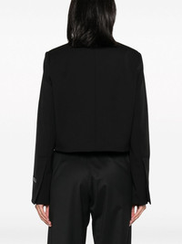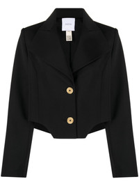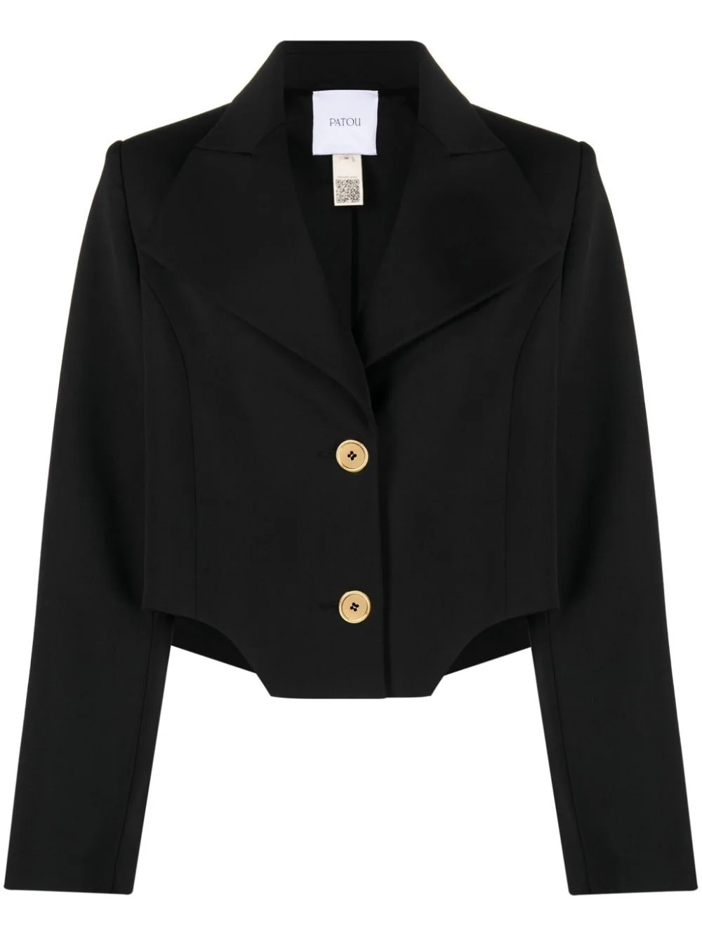 cropped virgin wool-blend blazer Woven in France from a technical wool twill, this black single-breasted jacket is Patou's contemporary take on the timeless blazer. Cut to a boxy-silhouette, it is fitted with an exaggerated point collar and geometric cut-out hem. Highlights - Black - Virgin wool blend - Oversized pointed collar - Front button fastening - Long sleeves - Split cuffs - Logo patch at the sleeve - Asymmetric hem - Cropped Imported Composition Virgin Wool 97%, Elastane 3% SIZE & FIT Model measurements Height 5 ft 10 in(1.78 m) Bust/Chest 33.07 in(84 cm) Hips 35.82 in(91 cm) Waist 25.98 in(66 cm) FittingInformation Designed for a relaxed fit, this piece allows for comfort and movement when worn Made from a midweight stretch fabric, this piece offers elasticity and flexibility when worn This piece fits true to size – take your usual size Washing instructions Dry Clean Only