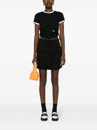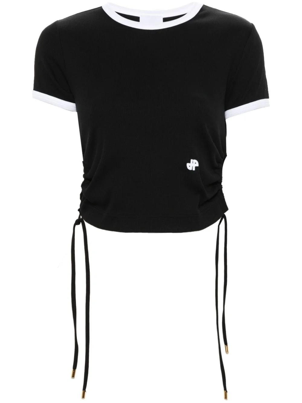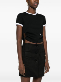 ribbed-knit cut-out T-shirt Highlights - Black - White - Stretch-cotton - Fine ribbed - Contrasting trim - Cut-out detailing - Side drawstring fastening - Embroidered logo to the front - Round neck - Short sleeves - Straight hem Imported Composition Polyester 100%, Cotton 98%, Elastane 2% SIZE & FIT Model measurements Height 5 ft 11 in(1.8 m) Bust/Chest 32.67 in(83 cm) Hips 36.22 in(92 cm) Waist 24.4 in(62 cm) FittingInformation Designed for a slim fit that sits just away from the body offering a close yet comfortable fit Made from a midweight stretch fabric, this piece offers elasticity and flexibility when worn This piece fits true to size – take your usual size