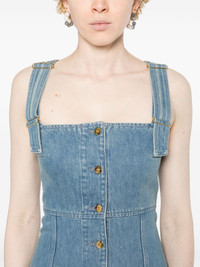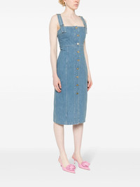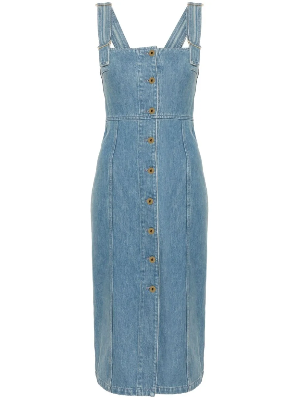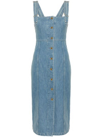 denim midi dress Highlights - Blue - Cotton blend - Denim - Round neck - Adjustable shoulder straps - Seam detailing - Central rear vent - Straight hem - Partial lining - Front button fastening Imported Composition Cotton 92%, Polyester 8% SIZE & FIT Model measurements Height 5 ft 9 in(1.75 m) Bust/Chest 34.64 in(88 cm) Hips 36.61 in(93 cm) Waist 26.37 in(67 cm) FittingInformation Designed for a close fit throughout The adjustable shoulder straps allow for a preferred fit when worn Sturdy and hard-wearing, this denim piece offers no stretch This piece fits true to size – those with curvy hips may wish to take one size up