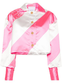 diagonal-striped cropped satin jacket Highlights - Fluorescent pink/white - Duchess satin weave - Diagonal stripe pattern - Notched collar - Drop shoulder - Logo print to the shoulder - Long sleeves with buttoned cuffs - Gold-tone buttons - Cropped - Straight hem - Front button fastening Imported Composition Polyester 100% SIZE & FIT Model measurements Height 5 ft 11 in(1.8 m) Bust/Chest 33.07 in(84 cm) Hips 37 in(94 cm) Waist 25.59 in(65 cm) FittingInformation Designed for a boxy fit, intended for a loose fit throughout Cropped in length Made from a midweight non-stretch fabric This piece fits true to size – take your usual size