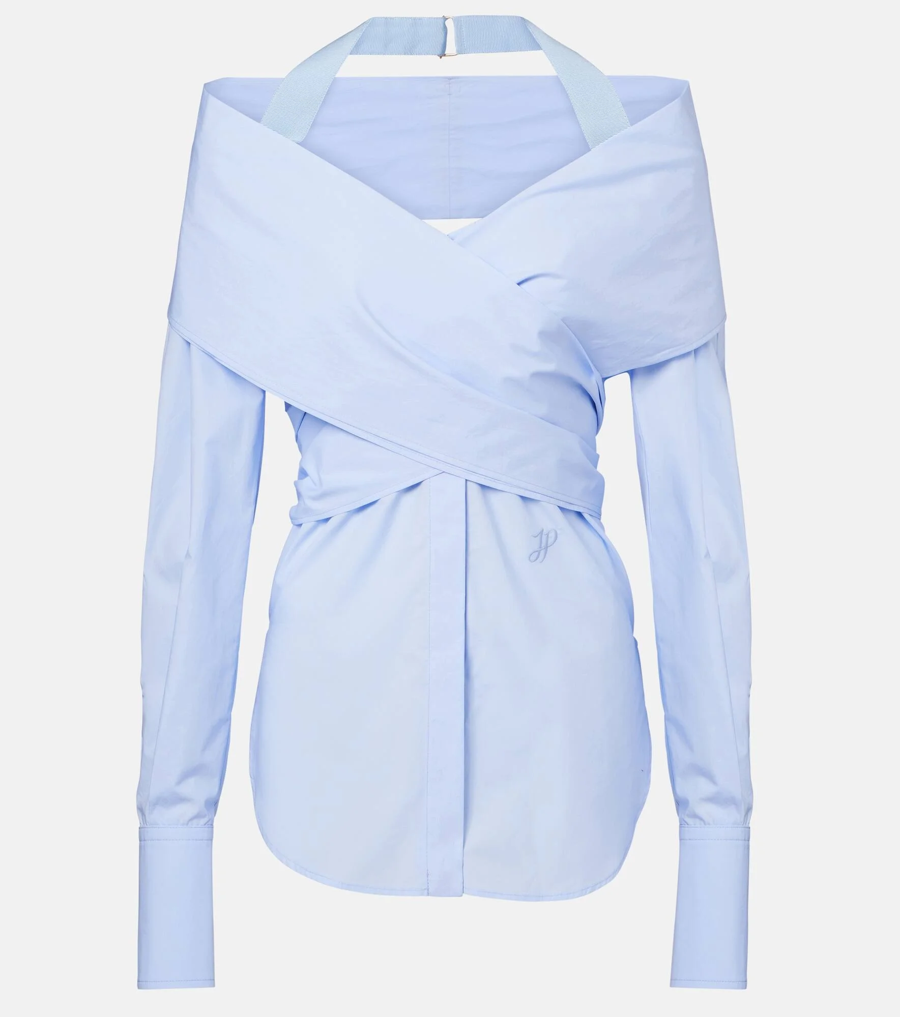 Founded by a French fashion visionary, Patou continues to define Parisian style with joyful and refined designs. This blouse with elongated sleeves features a design that wraps around the front and ties at the back. Product Details - Material: 100% cotton - Care instructions: machine wash at 30 degrees - Made in Poland - Designer color name: Aurora - Item color: blue - Item number: P01054440 Size & Fit - True to size - Cinched waist - Non-stretchy fabric - Falls below the hip - The model seen in the picture is 178cm-5'10" and wearing a size FR 36
