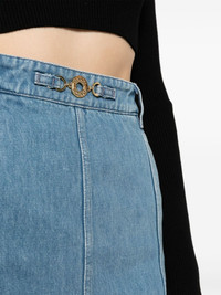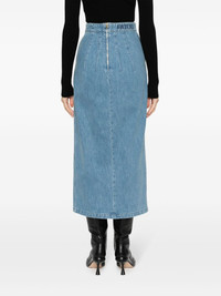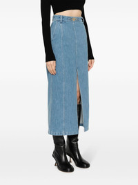 slit-detail organic-denim midi skirt Fitted with darts for a classic silhouette, this Patou denim skirt is cut to a mid-length. A gold-toned logo-engraved Medallion embellishes the front of the garment, complete with a daring slit. Highlights - Indigo blue - Cotton blend - Denim - High-waisted - Belt loops - Front button fastening - Front slit - Mid-length - Straight hem Imported Composition Zamak 100%, Cotton 92%, Polyester 8% SIZE & FIT Model measurements Height 5 ft 10 in(1.78 m) Bust/Chest 30.7 in(78 cm) Hips 36.22 in(92 cm) Waist 25.59 in(65 cm) Measurement HIPS 37.79 in(96 cm) LENGTH 34.64 in(88 cm) WAIST 29.13 in(74 cm) FittingInformation This maxi-length skirt is intended to be worn high on the waist The vented hem offers movement at the rear Made from a midweight stretch fabric, this piece offers elasticity and flexibility when worn This piece fits true to size – take your usual size Washing instructions Machine Wash